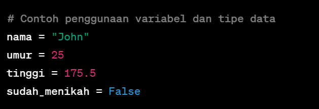 Mulai dengan memahami variabel (tempat menyimpan nilai), tipe data (integer, float, string, boolean), serta operasi matematika sederhana. Contoh kode pertama yang biasa diajarkan: